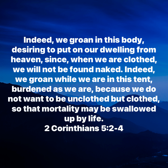 I don’t groan as in I am ready to die and leave this earth. I groan for the perfect: to put off this body of flesh and put on the glory of The Eternal. But I am not ready to go home yet, Father, You know. My life and work here is incomplete. You are not finished with me yet. There is much more to learn, grow into, and experience. And there is a testimony and service still in me for those You send me to. Here am I, O God. Have Your own way. In Jesus, Amen.