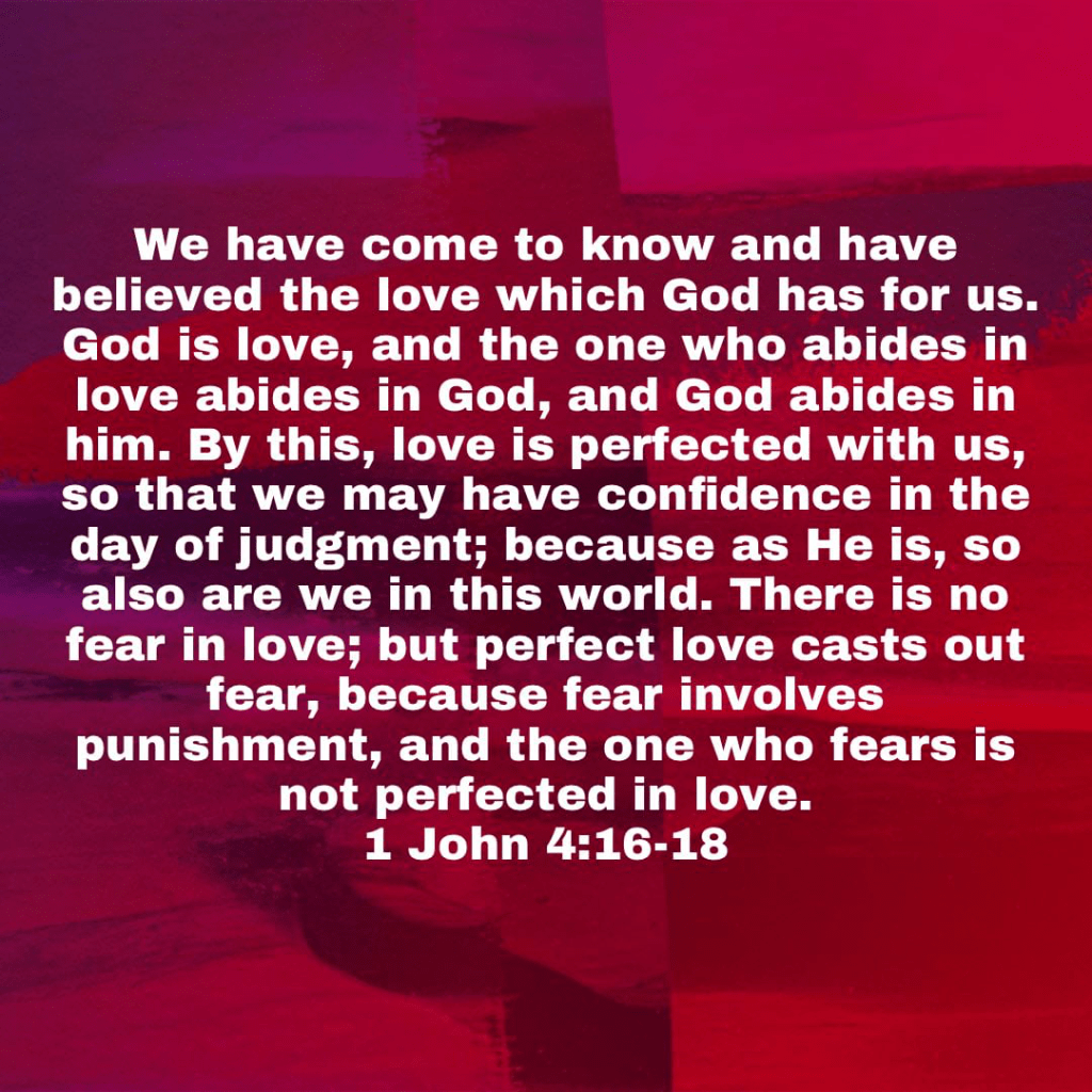 “We have come to know and have believed the love which God has for us. God is love, and the one who abides in love abides in God, and God abides in him. By this, love is perfected with us, so that we may have confidence in the day of judgment; because as He is, so also are we in this world. There is no fear in love; but perfect love casts out fear, because fear involves punishment, and the one who fears is not perfected in love.” – 1 John 4:16-18 NASB1995