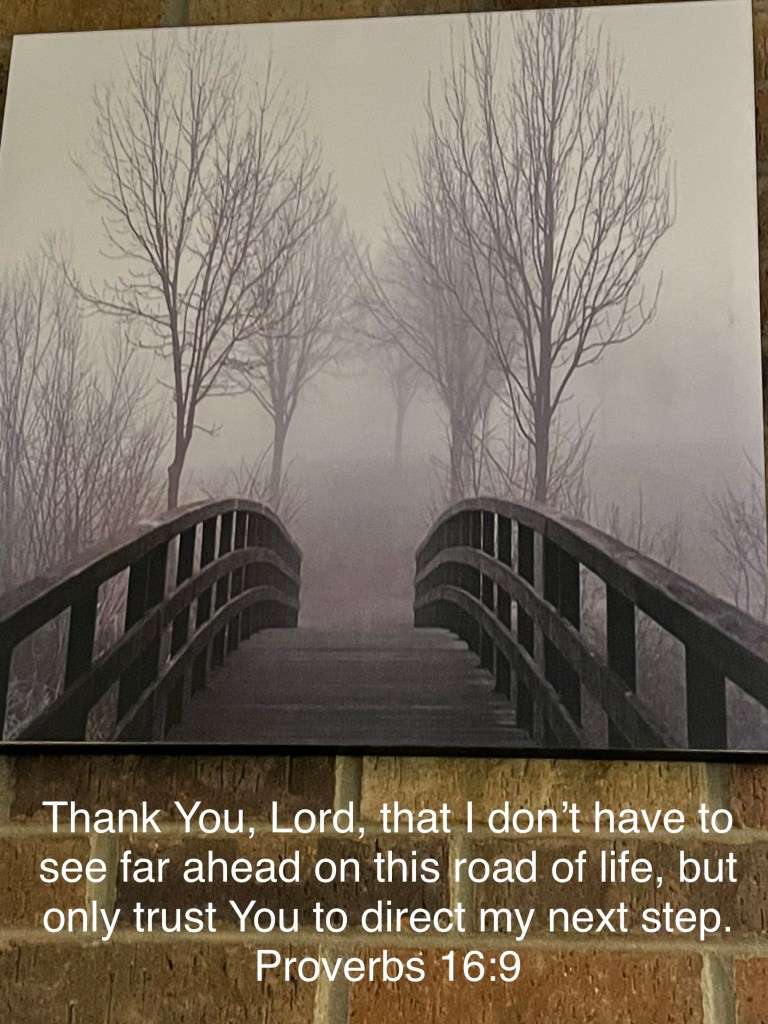 I know I’ve shared this before, but I got this wall hanging right after we bought this house. I was walking through Walmart, talking to God about feeling lost, unable to see the path ahead. I had that sense of lostness for awhile, as God started moving our hearts from our home and life of 32 years, to new horizons on unknown paths. When we found our new home, that lostness multiplied. So that day in Walmart, as I talked to my God about these things, this painting caught my eye and God said clearly to my heart, “I know the path ahead. You just need to trust Me for the next step.”